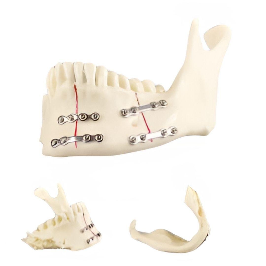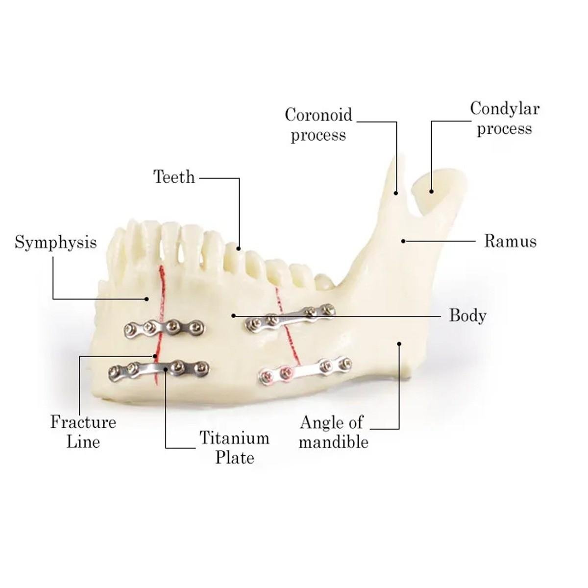 This educational model showcases the anatomy of the human mandible along with a simulated mandibular fracture and its surgical fixation. The model includes the following labeled parts: