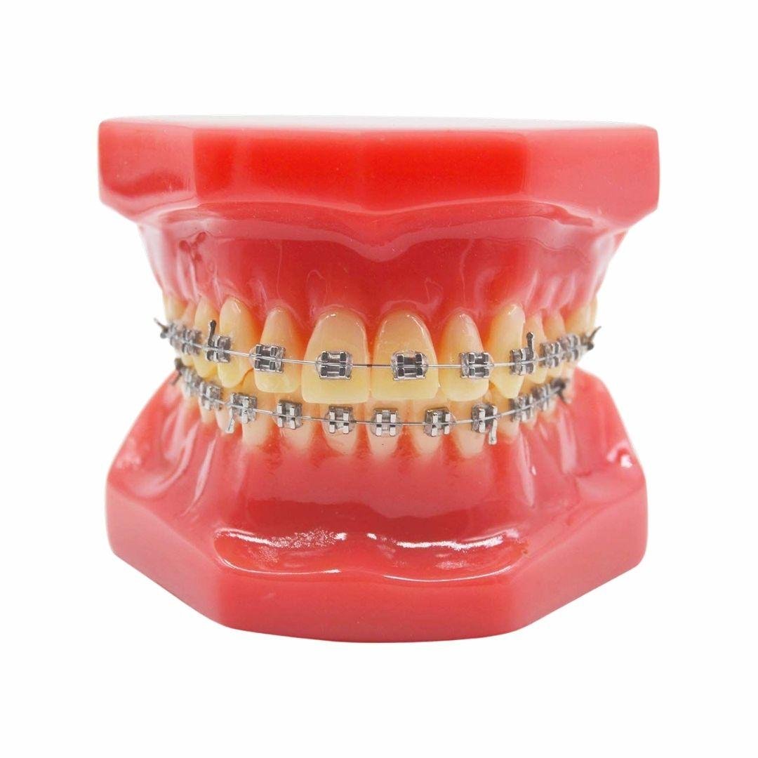The Orthodontic Model with Metal Brackets is a professional-grade dental model designed to demonstrate fixed orthodontic treatment using traditional metal braces. This life-size model features upper and lower adult dentition with accurately placed stainless steel brackets and archwires, making it an excellent visual aid for patient education, clinical instruction, and orthodontic demonstrations.