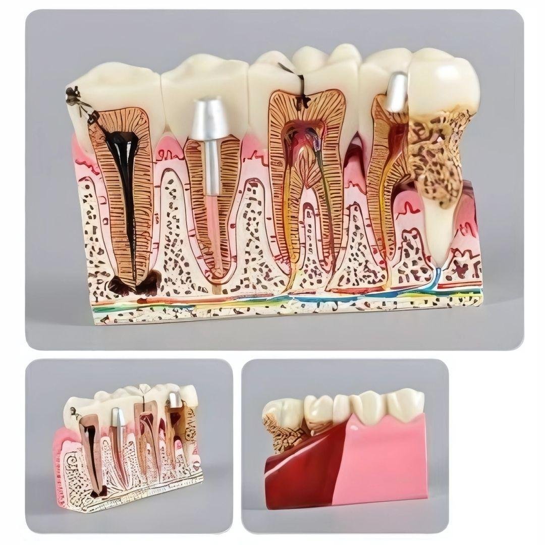 This detailed anatomical model illustrates various dental pathologies and treatments in a single cross-sectional display. It showcases conditions such as tooth decay, pulp infection, abscess formation, gum disease, bone loss, and implant placement. Ideal for dental professionals, educators, and students, this model provides a clear, visual representation of common oral health issues and their clinical interventions.